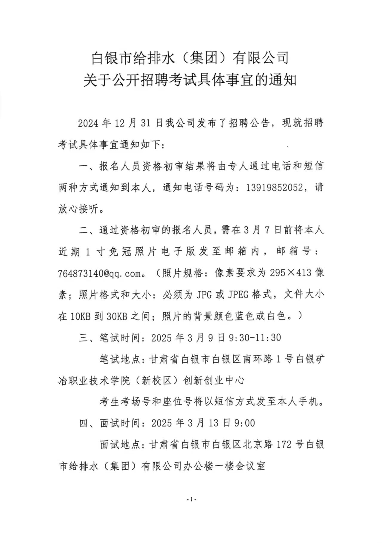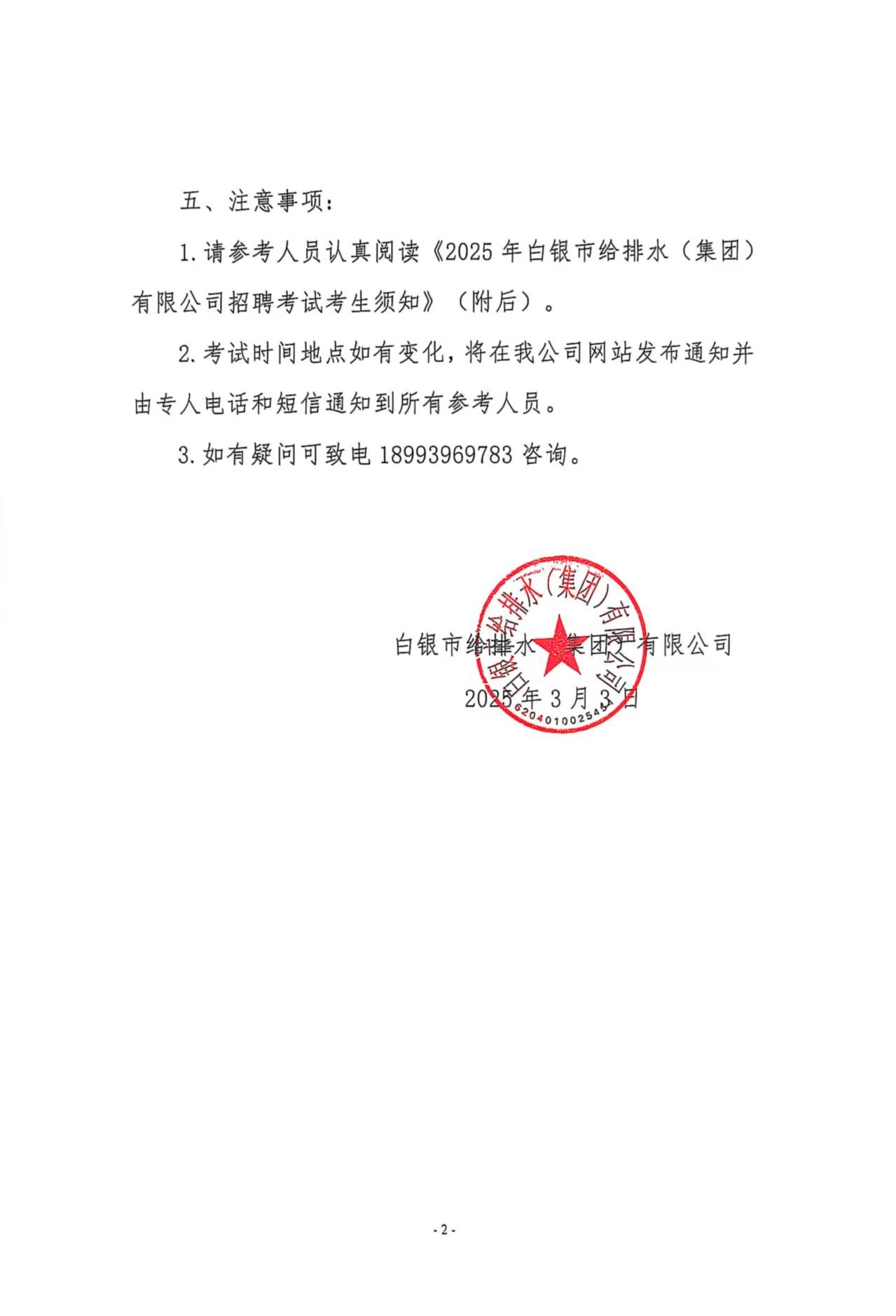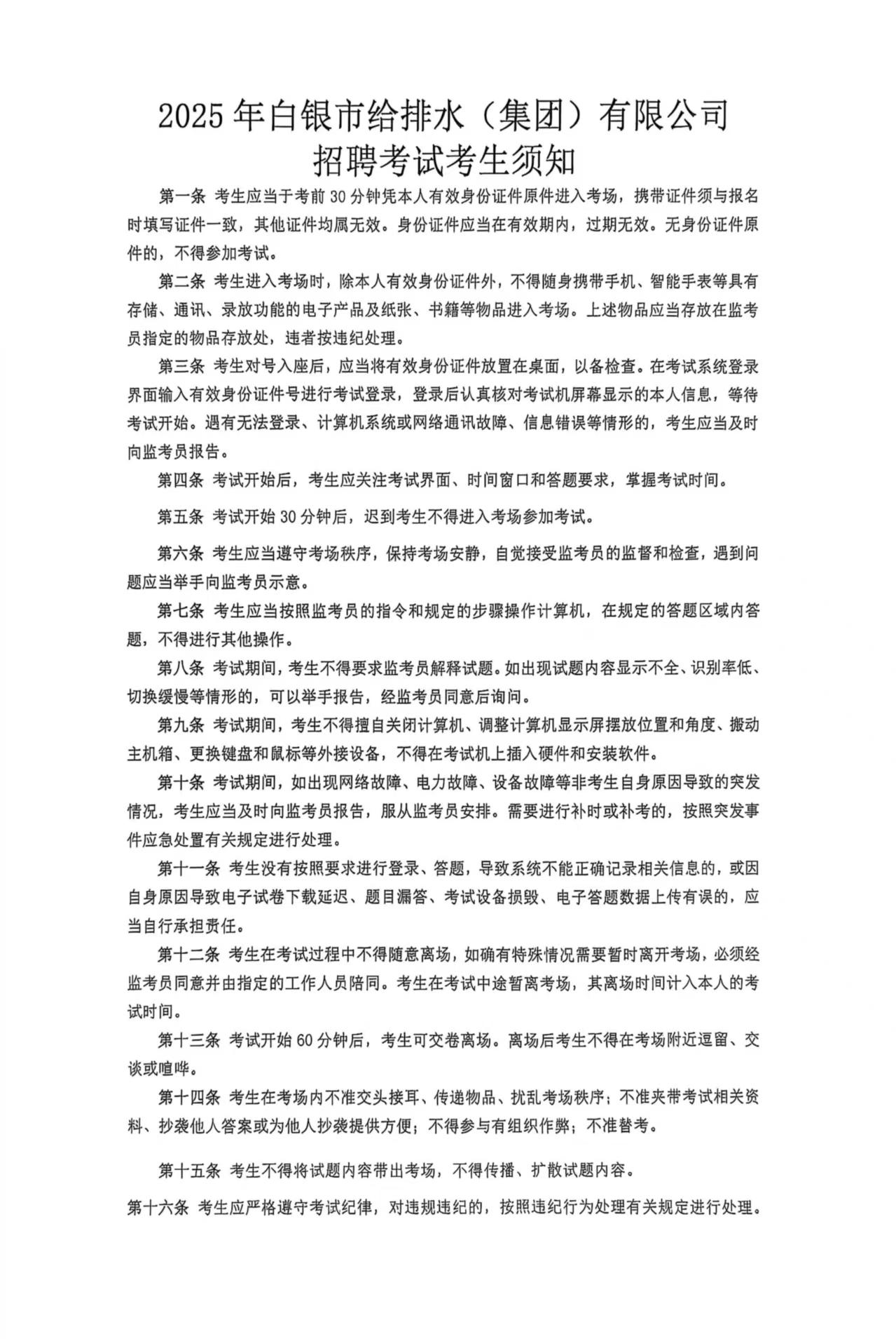 白銀市給排水(集團)有限公司關于公開招聘考試具體事宜的通知