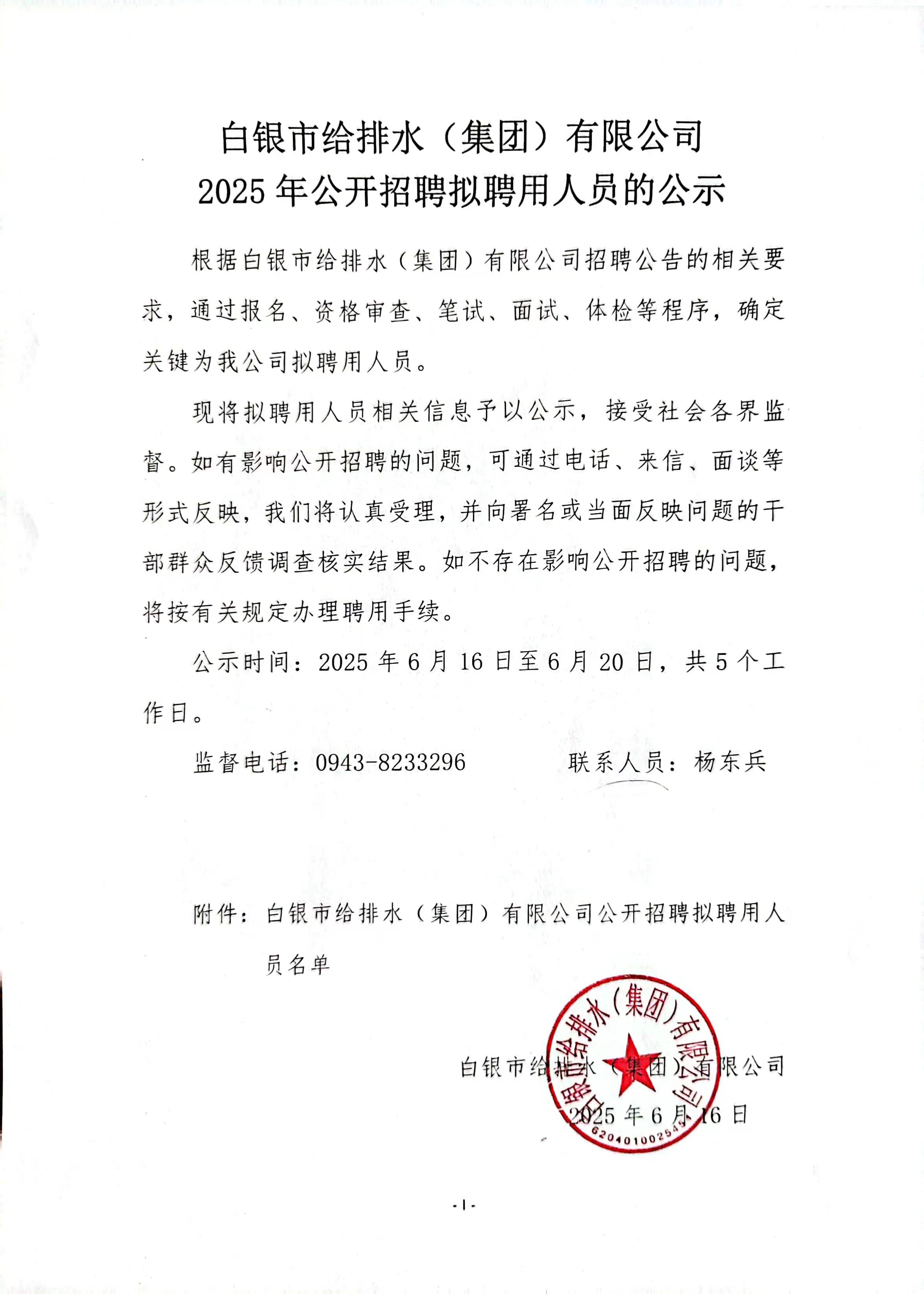 白銀市給排水(集團(tuán))有限公司2025年公開(kāi)招聘擬聘用人員的公示